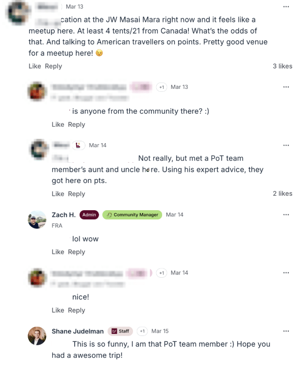- A member who redeemed Marriott points at the JW Marriott Masai Mara and ran into the family member of a member of our team
