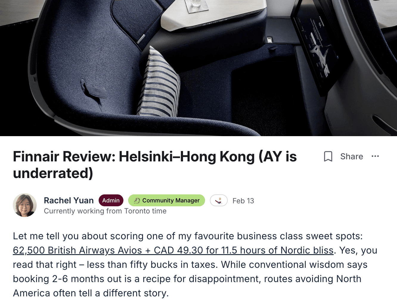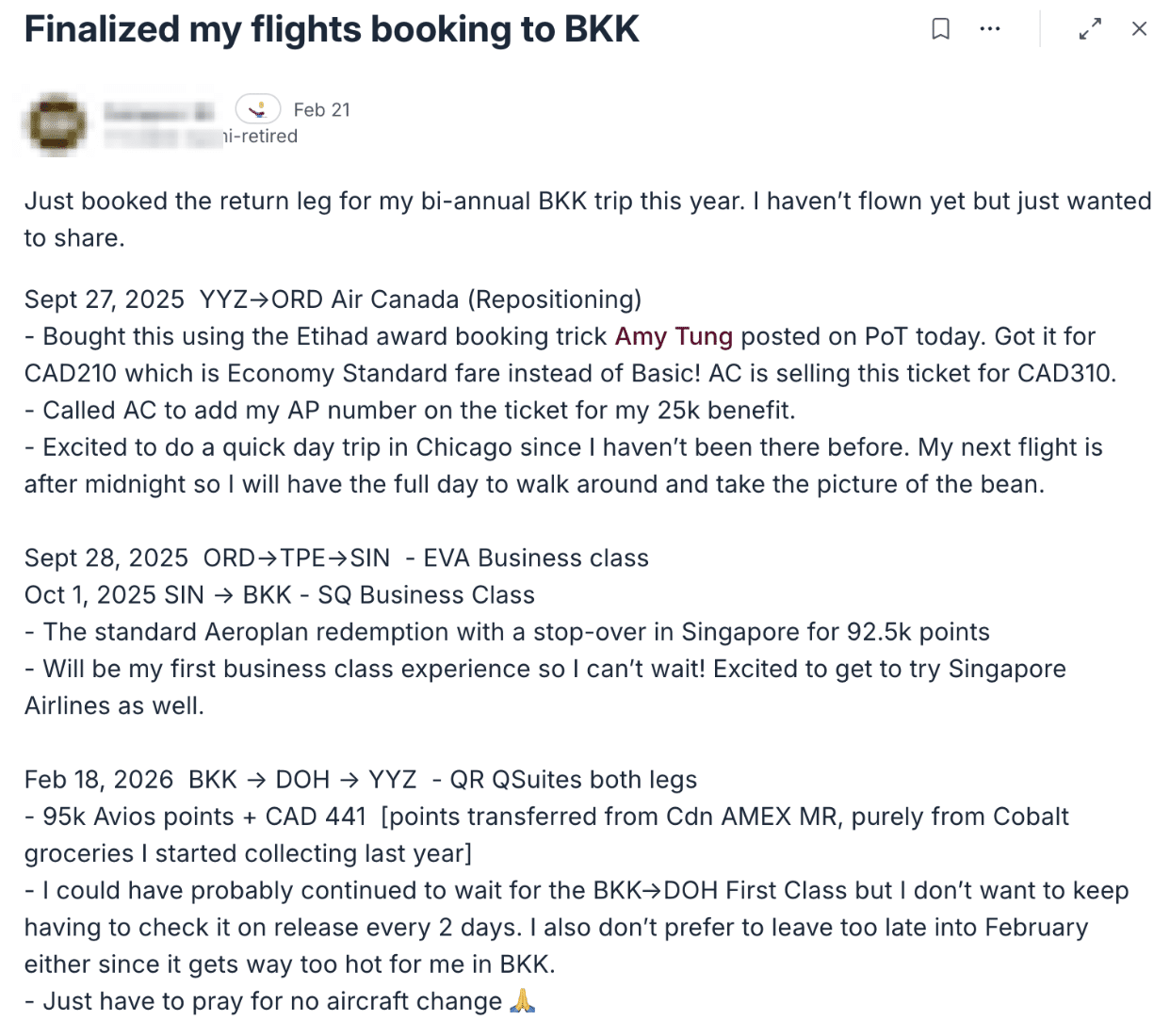 I’ve been particularly excited watching members use the platform to document their booking processes and create informal case studies. Just last month, we had a member walk through their entire experience booking round-trip business class flights for two on Qatar Airways Qsuites business class visiting the Maldives in First Class.