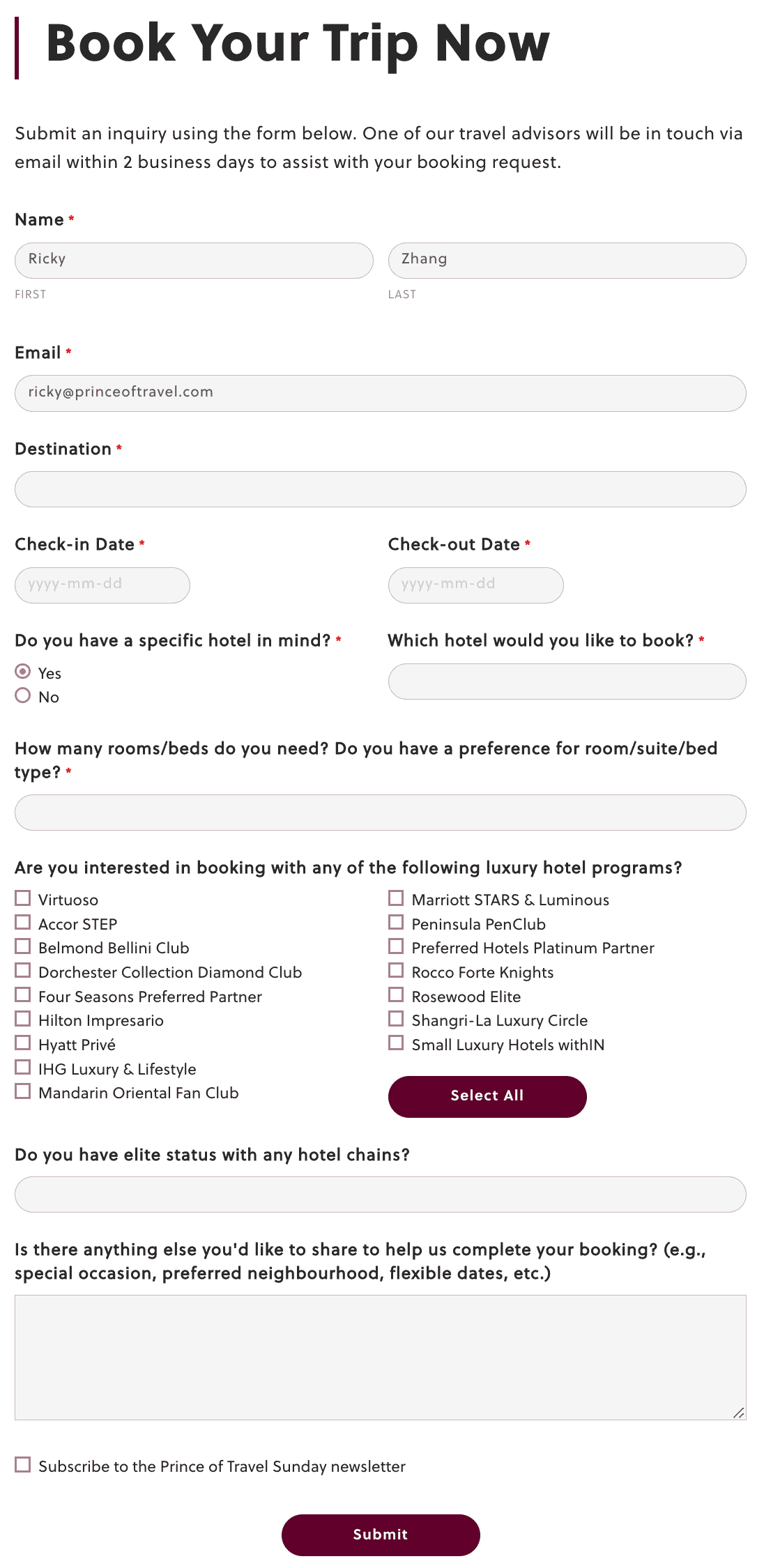 One of our travel advisors will be in touch via email within 2 business days to assist with your booking request. Prince of Travel members receive priority handling on their booking requests, based on membership tier.