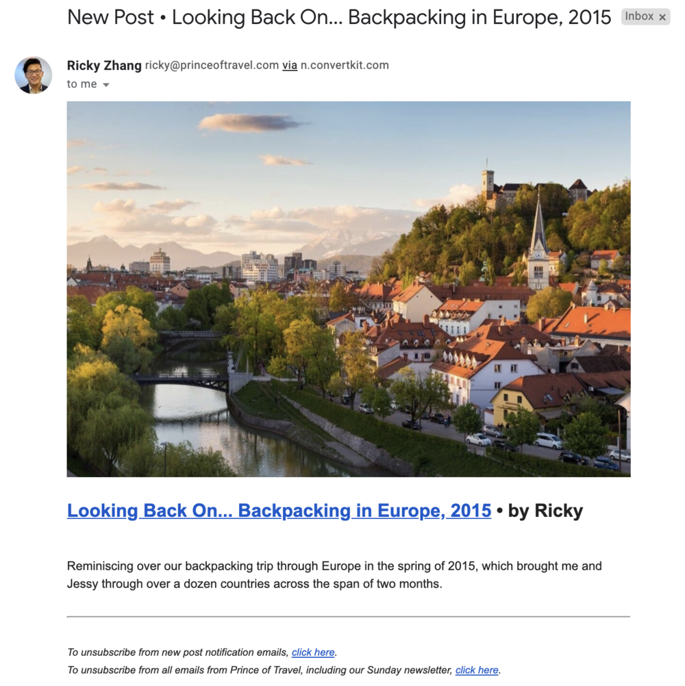 That’s why I’ve created a new feature for our email list, which essentially tracks the RSS feed in email form and is designed to notify you every time a new post is published on Prince of Travel. Shortly after a new post goes live, you’ll receive a nicely dressed-up email as follows inviting you to check it out: