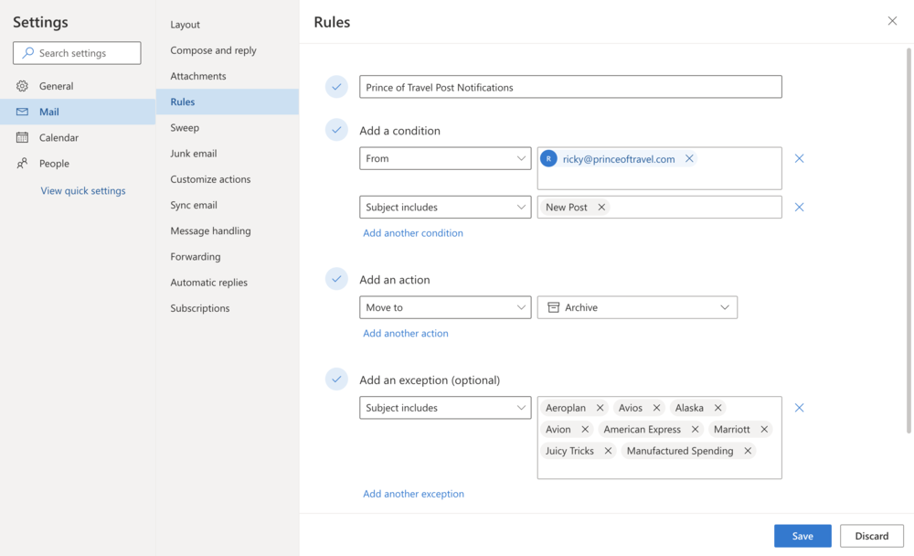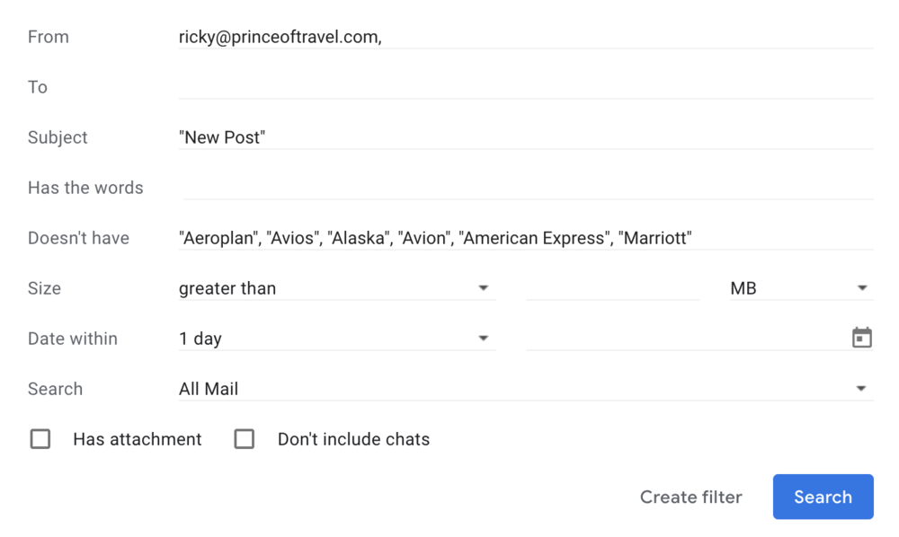 If you primarily care about credit card deals and tips, then you could include all of the names of credit card issuers in your keywords; if you’re mostly here for the fancy travel reviews, then you could include “Review” as one of your keywords. No matter what specifically piques your interest, setting up an email filter will allow you to tailor our Blog Post Notification emails to only the subjects that matter to you most.