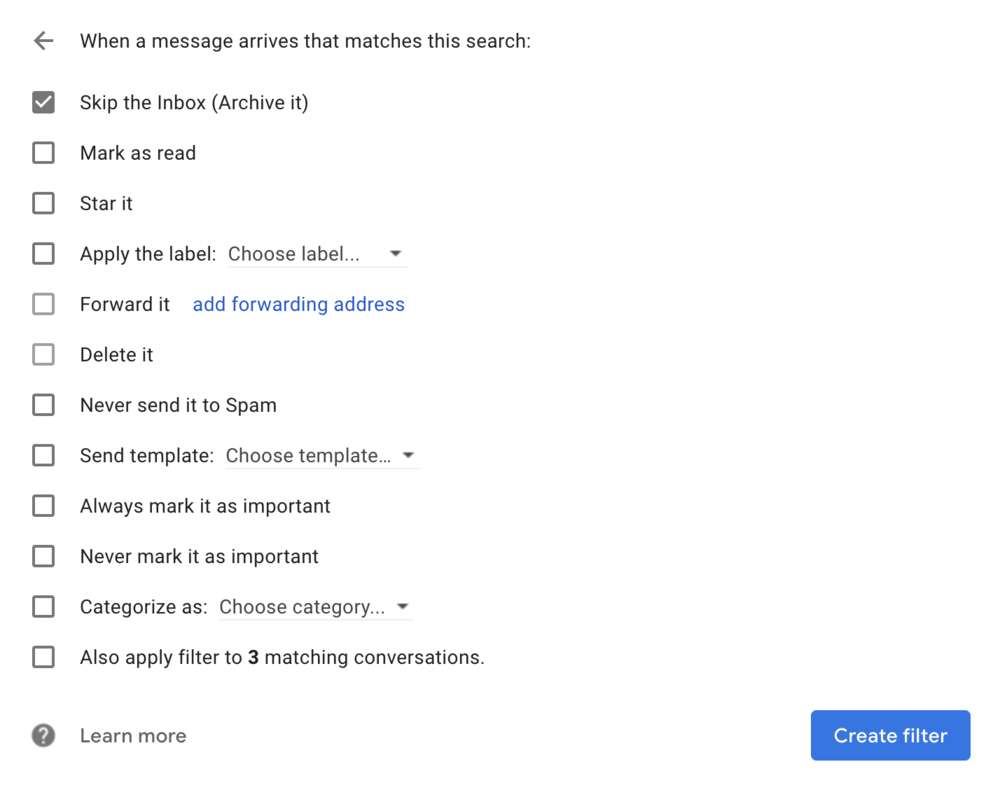 Click “Create Filter”, then tick “Skip the Inbox (Archive it)”, followed by “Create Filter” again.