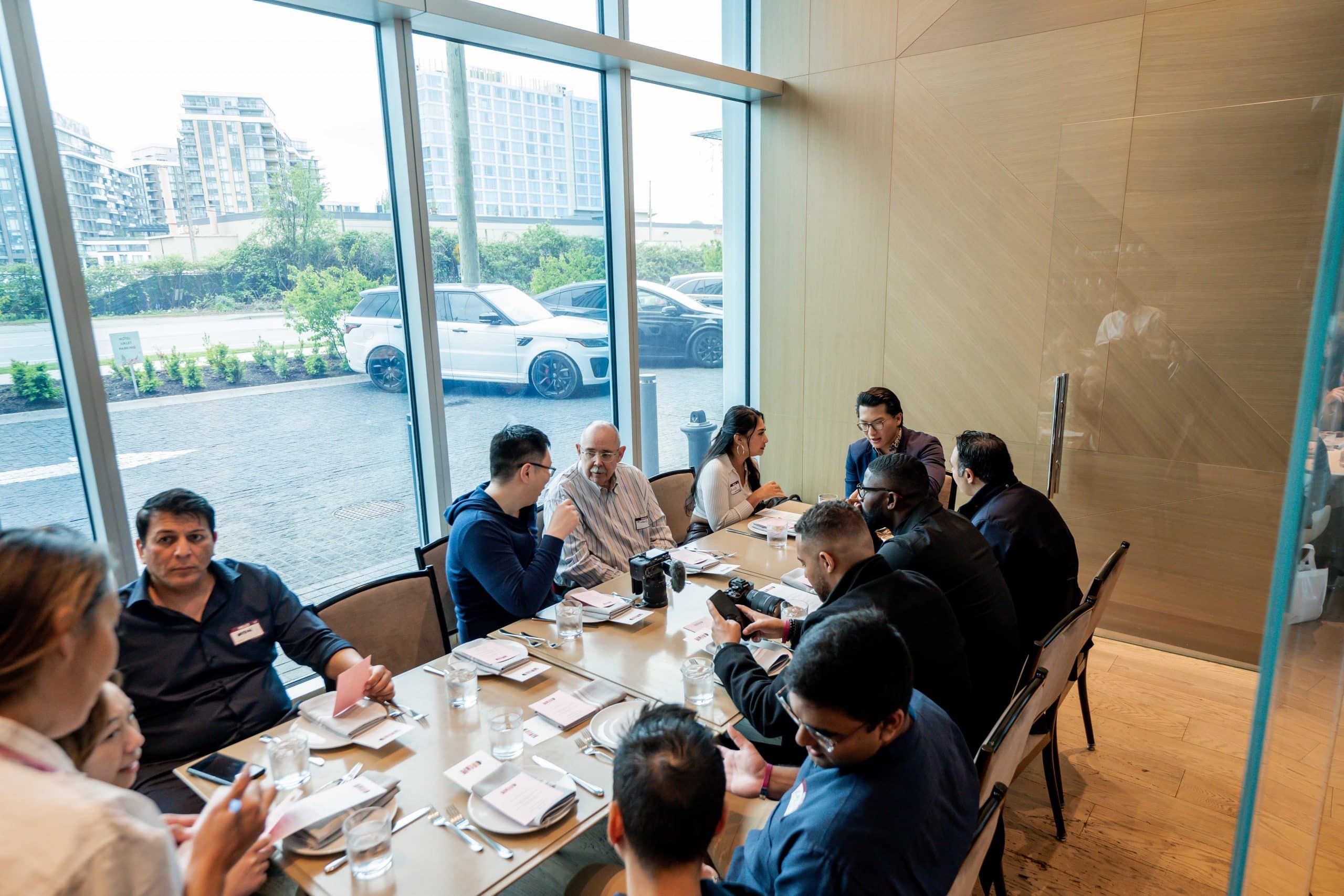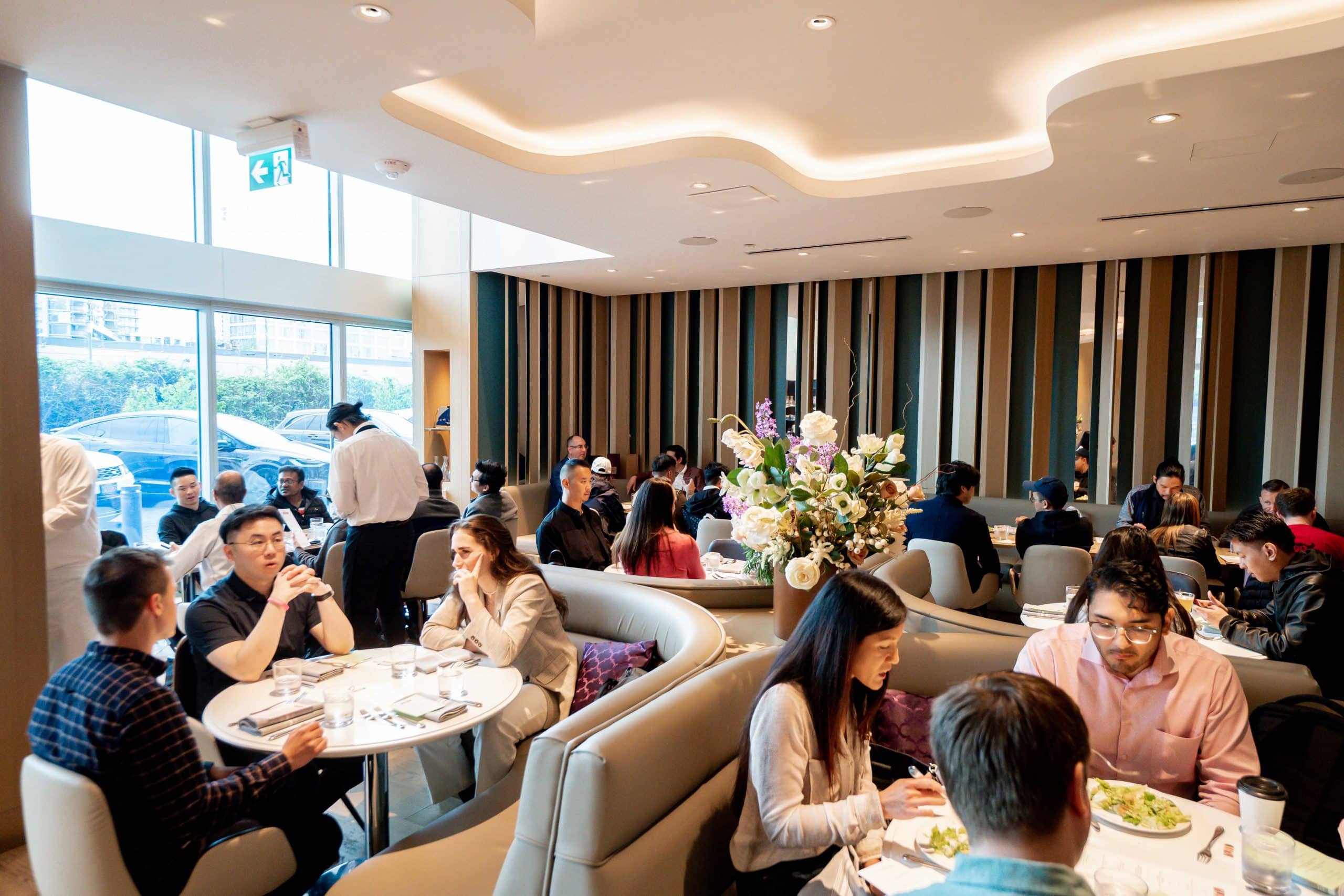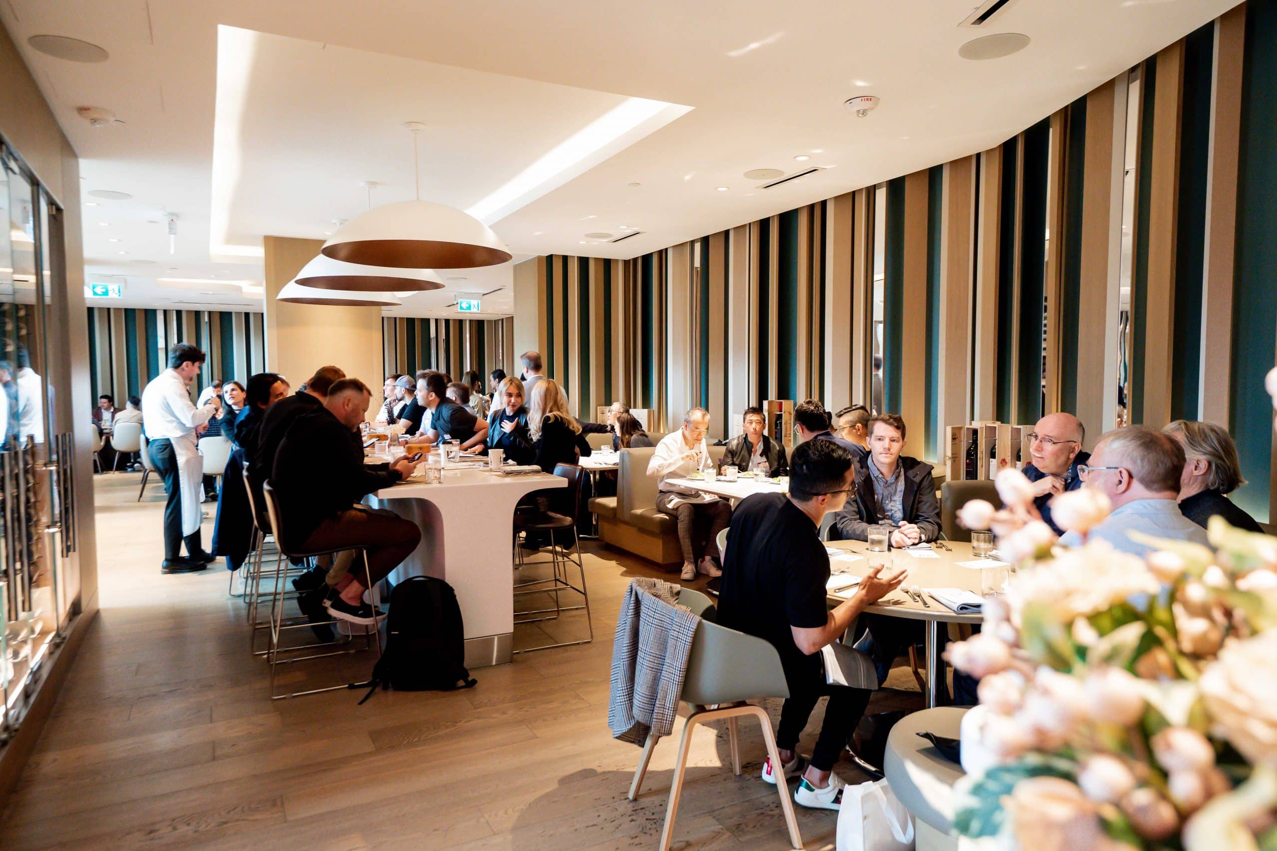 Attendees gathered and continued to network as they enjoyed a lunch service. The restaurant staff took orders for drinks, for which attendees could redeem their complimentary tickets, and started the three-course meal service.