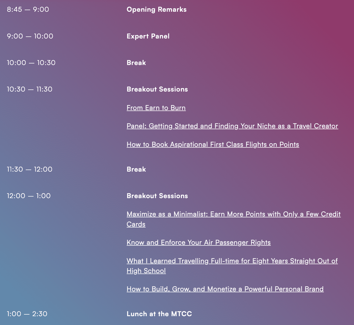 Each breakout time slot features one topic in each of our four tracks, styled under the broad themes of Miles & Points – The Points Beginner, Miles & Points – The Frequent Flyer, Travel Freedom – The Lifestyle Designer, and Travel Freedom – The Content Creator.