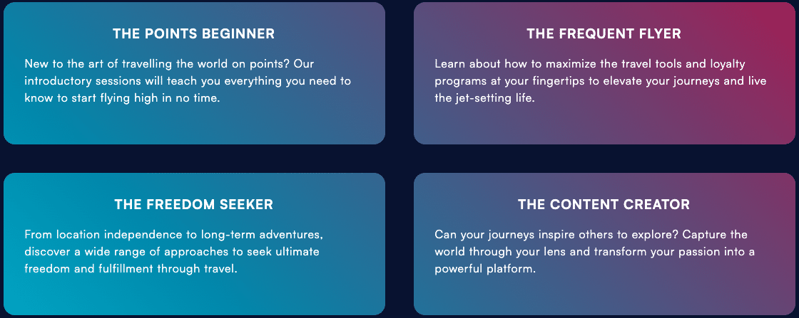 Each breakout time slot features one topic in each of our four tracks, styled under the broad themes of The Points Beginner, The Frequent Flyer, The Freedom Seeker, and The Content Creator.