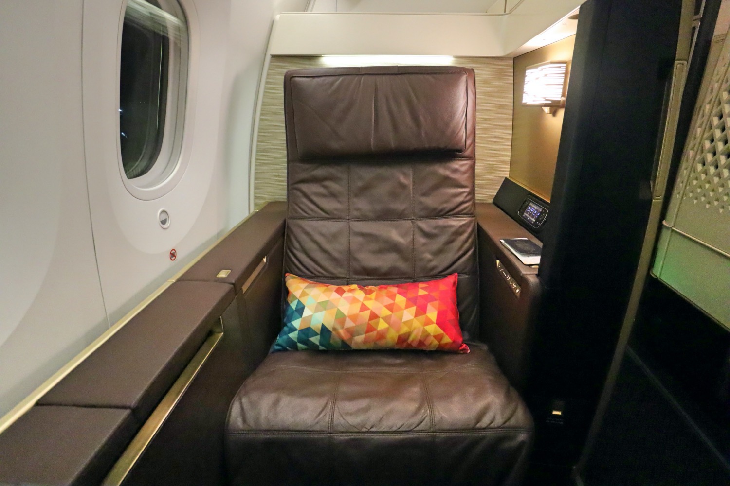 Once you’re ready to board the flight, you’ll be ushered to your suite by the flight attendants, who make you feel welcome at every step along the journey. The suite on the 787 has plenty of space and features to explore.