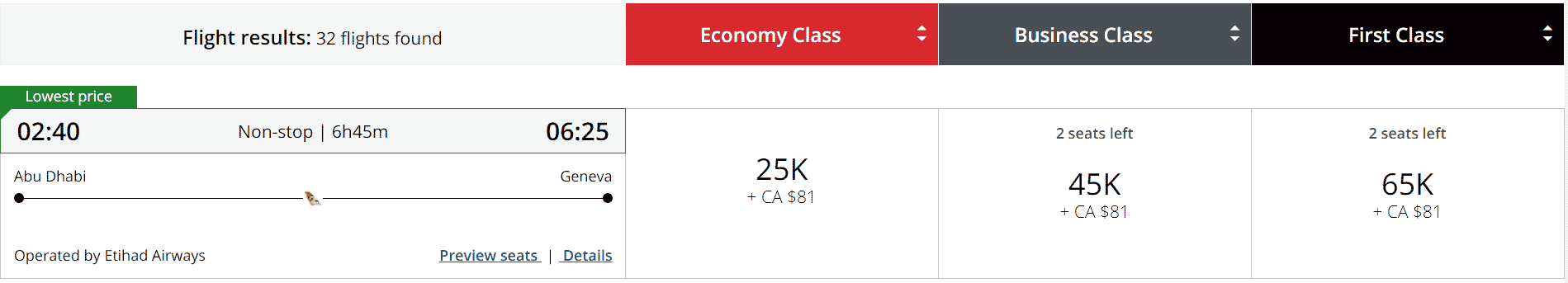 Shorter routes within the Atlantic zone (such as Abu Dhabi to European destinations) have historically been available from approximately 65,000 Aeroplan points one-way in First Class.