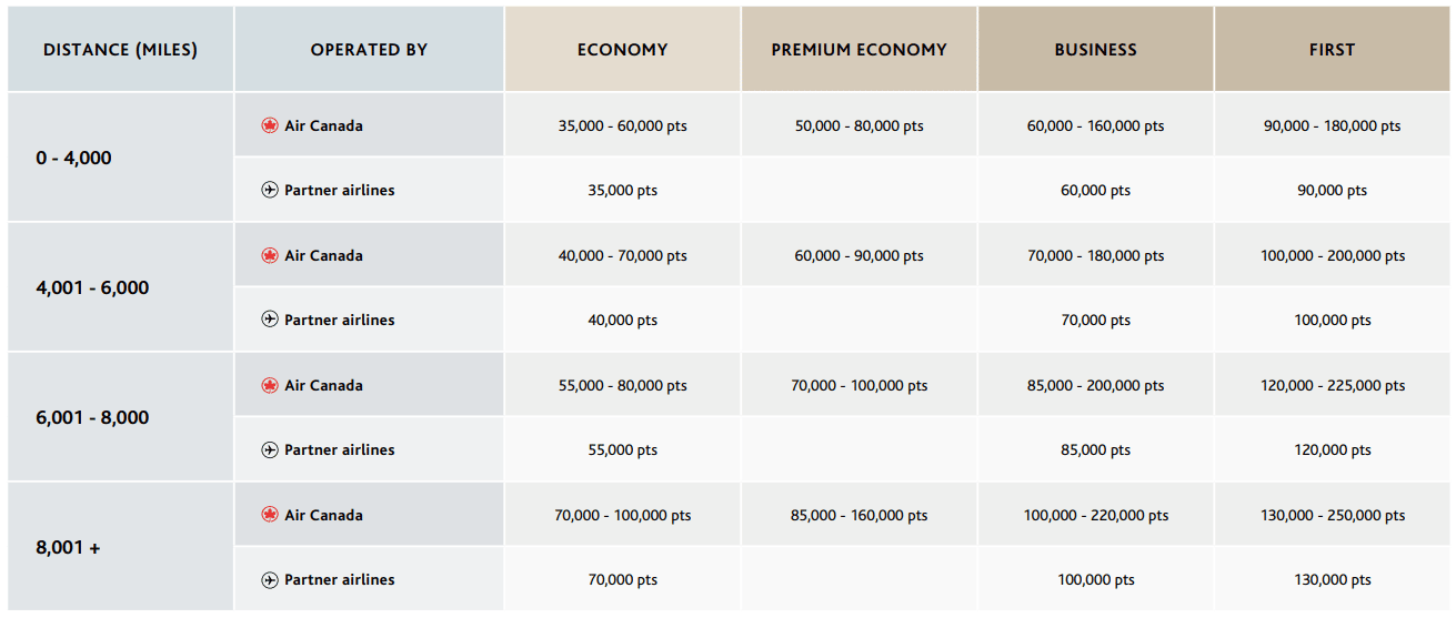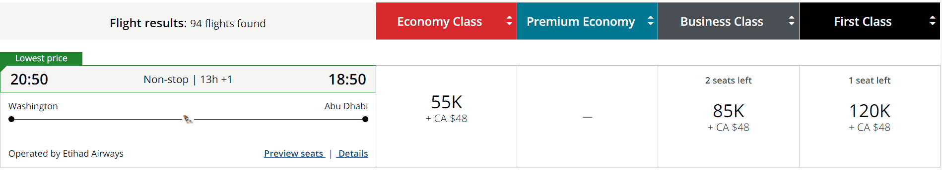 Aeroplan uses dynamic pricing for Etihad Airways (along with Emirates, United, and flydubai), meaning pricing fluctuates based on demand and travel dates. The approximate benchmarks below provide a reference point, but actual pricing may vary. Note that most of Aeroplan’s 35+ other partners remain on a fixed distance-based award chart.