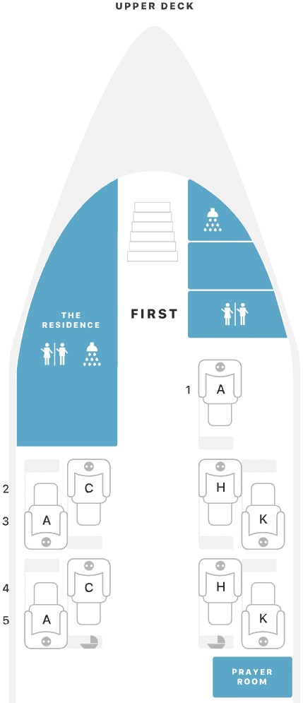 On board the A380, there are a total of nine First Class suites spread out across five rows. Including The Residence, there are at most 10 passengers in the First Class cabin.