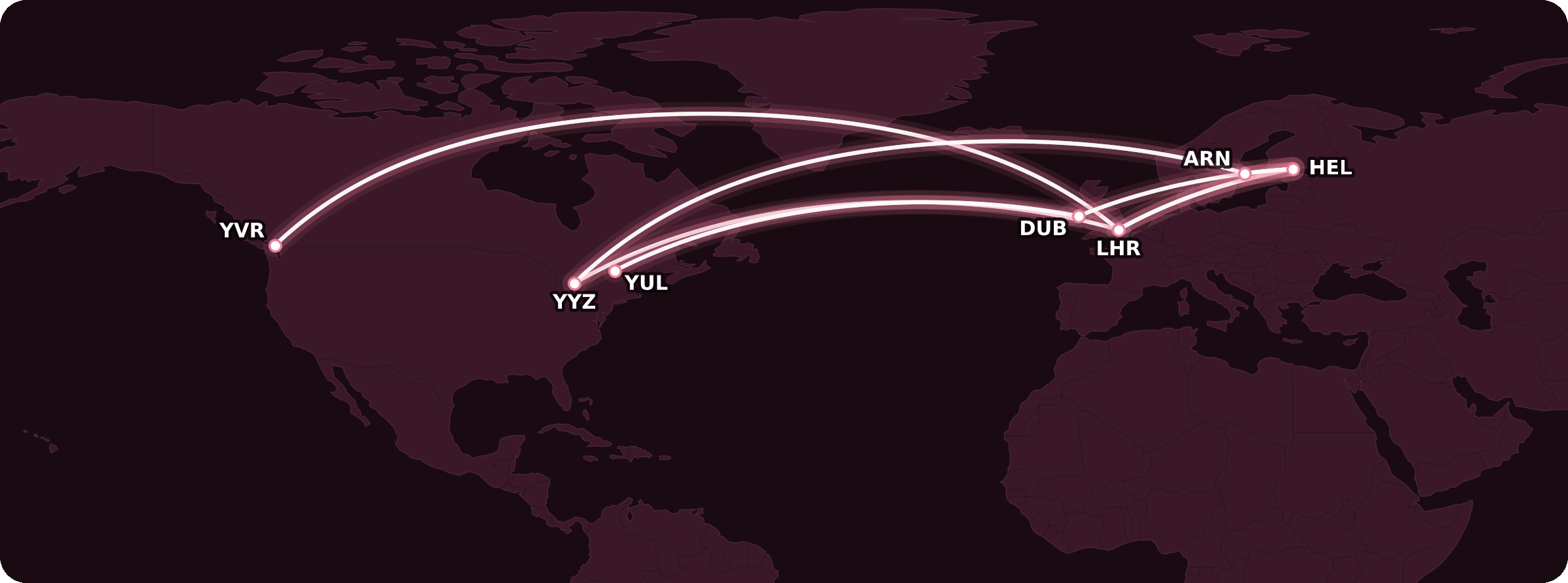 Finnair does not operate direct flights from Canada. However, Helsinki is easily reachable from Canadian cities through connecting itineraries – and the geography works strongly in Finnair's favour.
