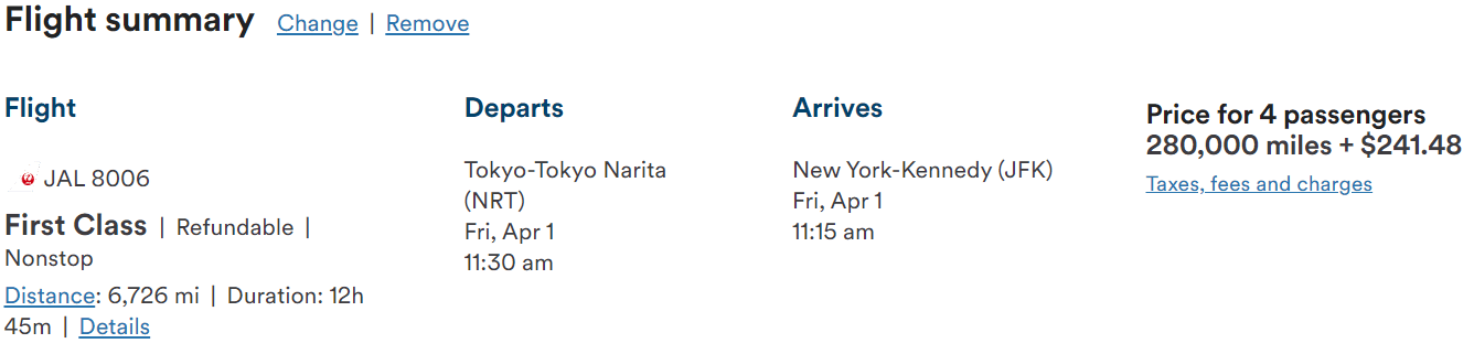 How Many Points Does Japan Airlines First Class Cost?