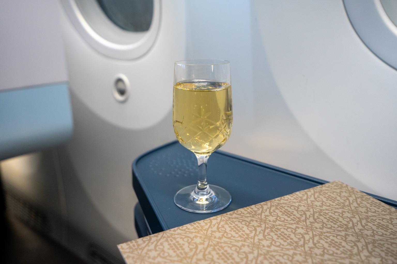 Upon boarding, passengers are offered a choice of welcome beverage — a choice between Champagne or orange juice.