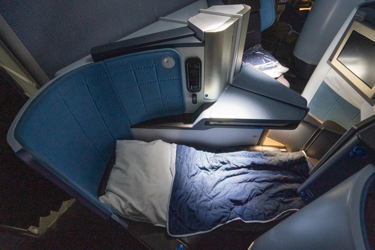 Four buttons control the positioning of the seat, which can be turned into a lie-flat bed – a must for any long-haul business class product these days.