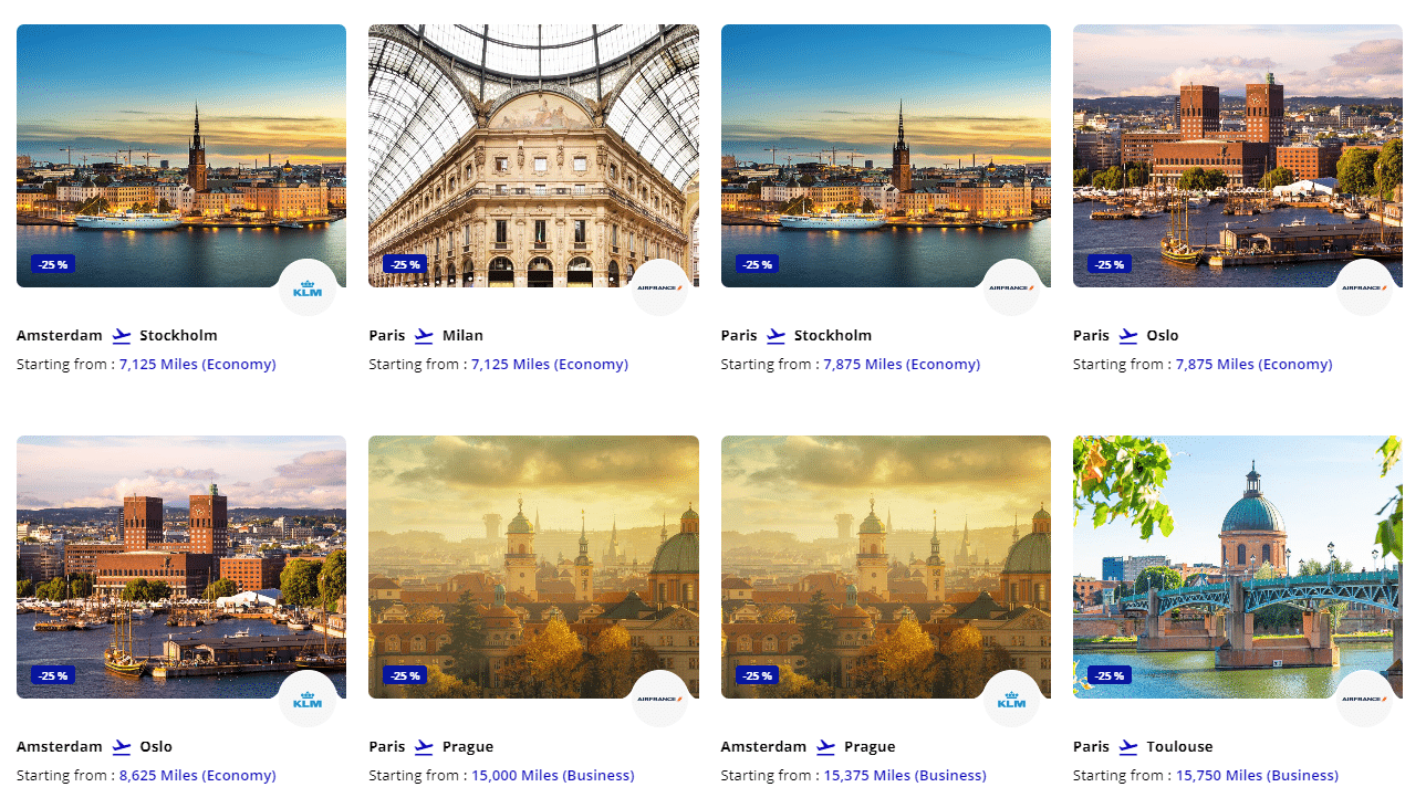 Flying Blue Promo Rewards offers reduced award pricing on specific routes each month. Routes between North America and Europe are often featured, with one-way business class redemptions going for as few as 27,500 miles.