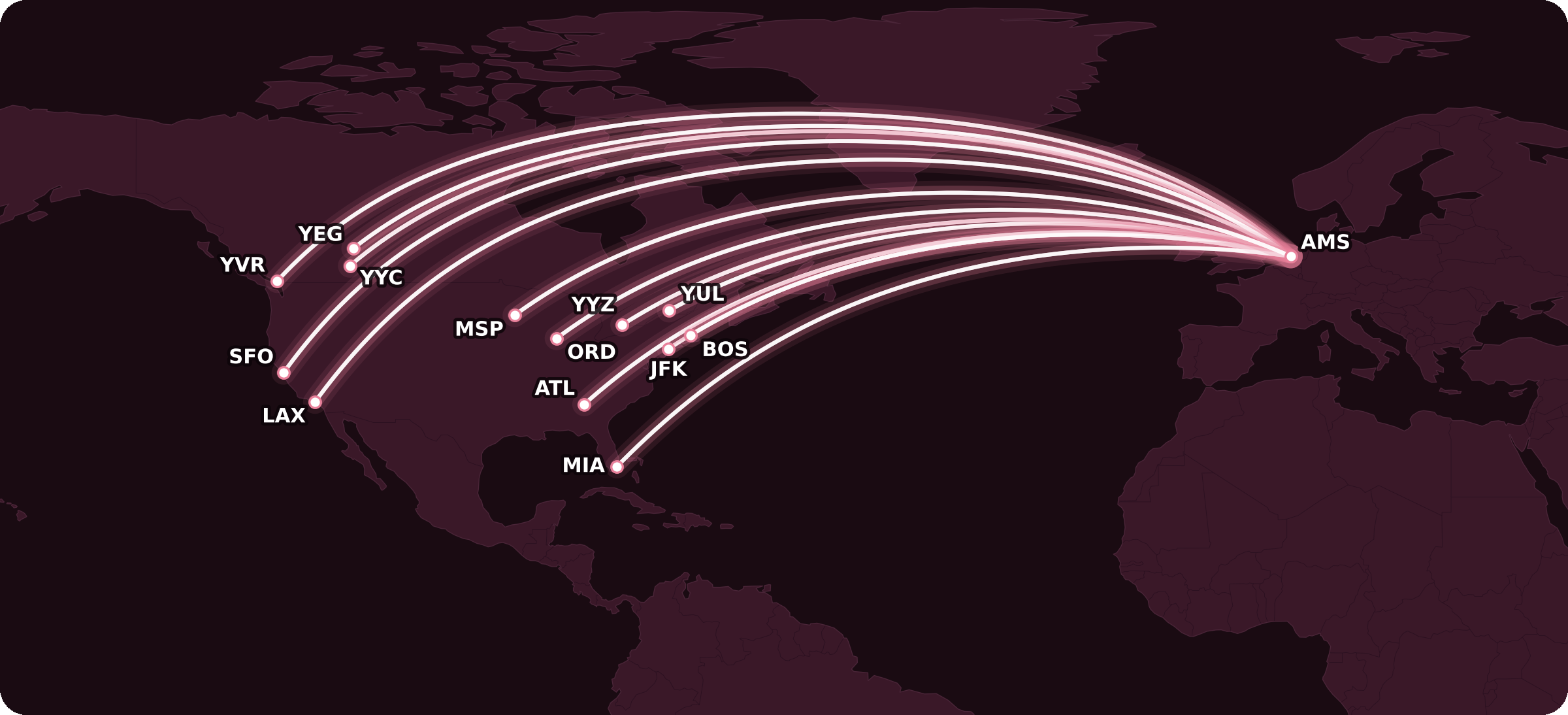 In Canada, KLM flies to Toronto, Vancouver, Montreal, Calgary, and Edmonton, while in the US, the airline flies to 13 cities, including the usual gateway cities of New York, Miami, and Los Angeles.