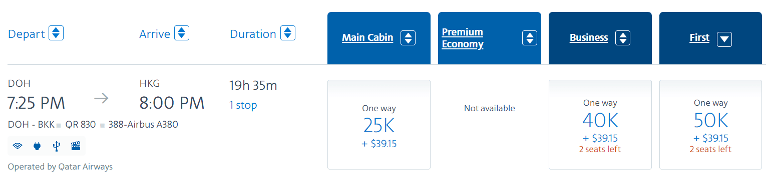 For the exact same price, you can fly on the same Doha to Bangkok flight with Qatar Airways in First Class, have a stopover in Bangkok, and then continue onward to Hong Kong at no extra cost.