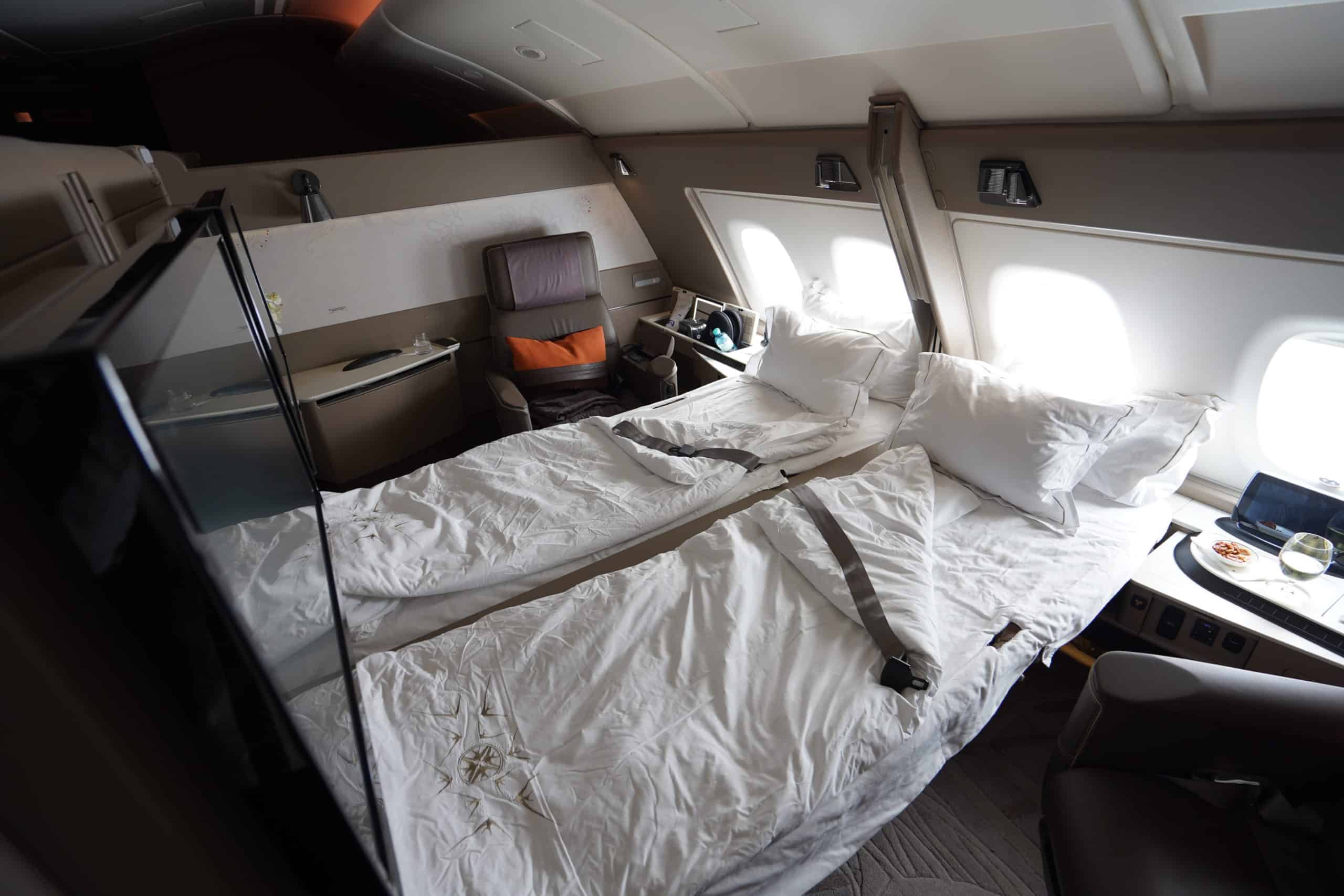 What Singapore Airlines Suites Class is most known for is the double bed in the sky. Where other airlines may offer a double bed option on select premium products, often the two beds are not 100% connected, as the bottom half tends to be tucked away in separate compartments and footwells.