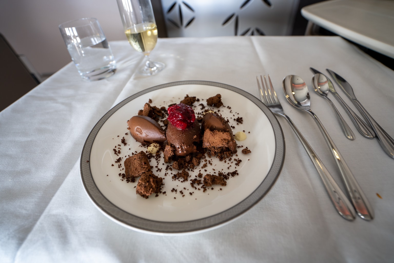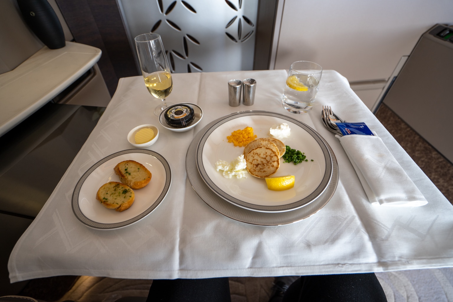 Dining together in First Class on the Boeing 777 is only possible for those sitting in the two middle rows with a lowered partition. You won’t be face to face, but you’ll be right next to each other, making it easy to toast to the experience.