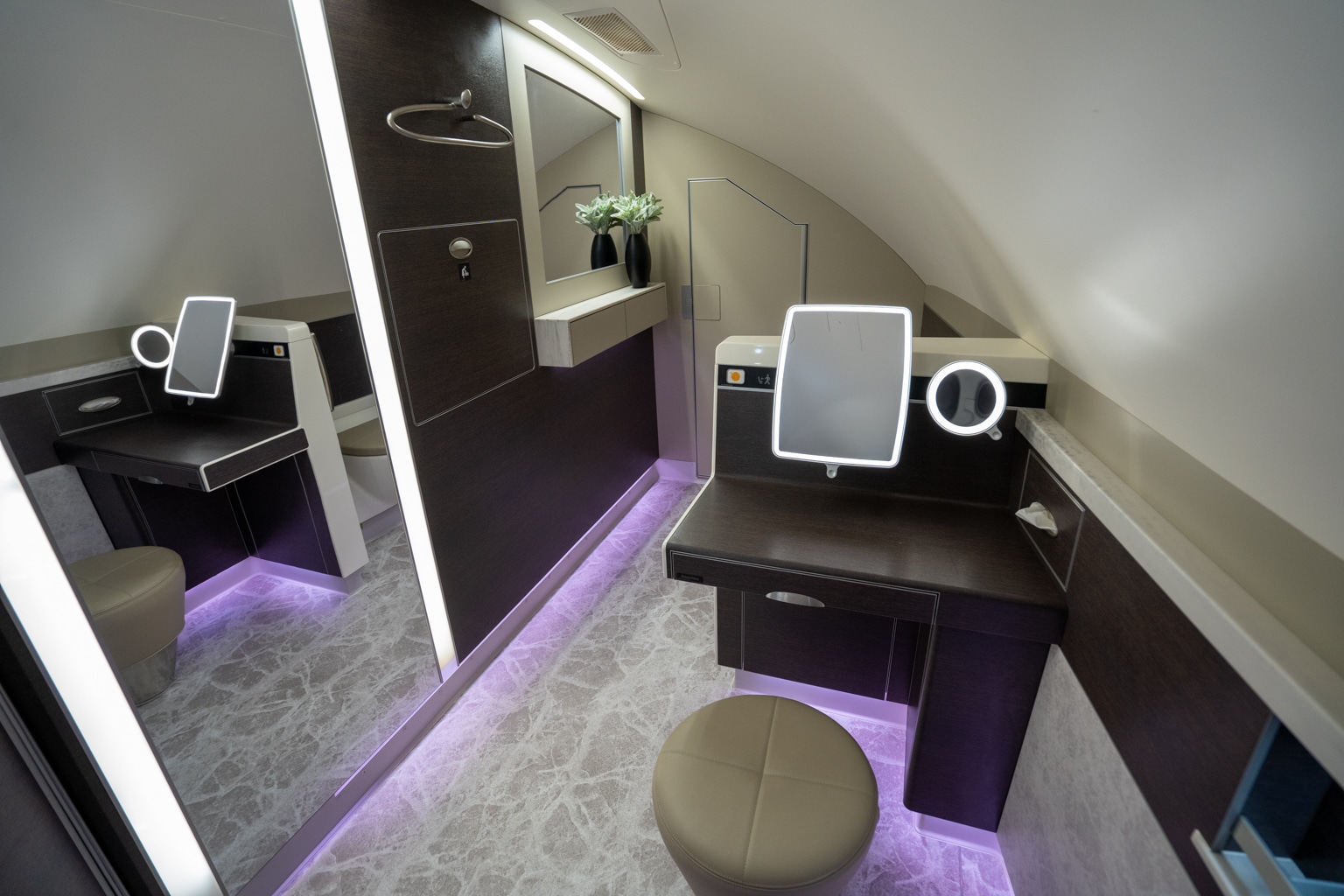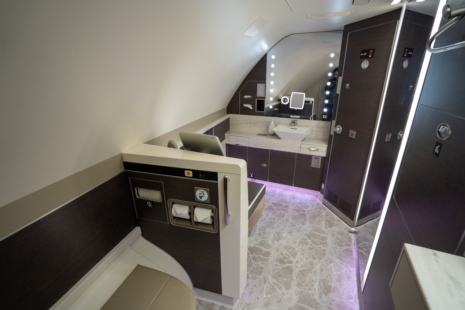 There are two restrooms exclusively available to Suites Class passengers. Located at the front of the aircraft, the restroom on the right side is slightly bigger, but both are very spacious and come with everything you need to freshen up before going back to your suite.