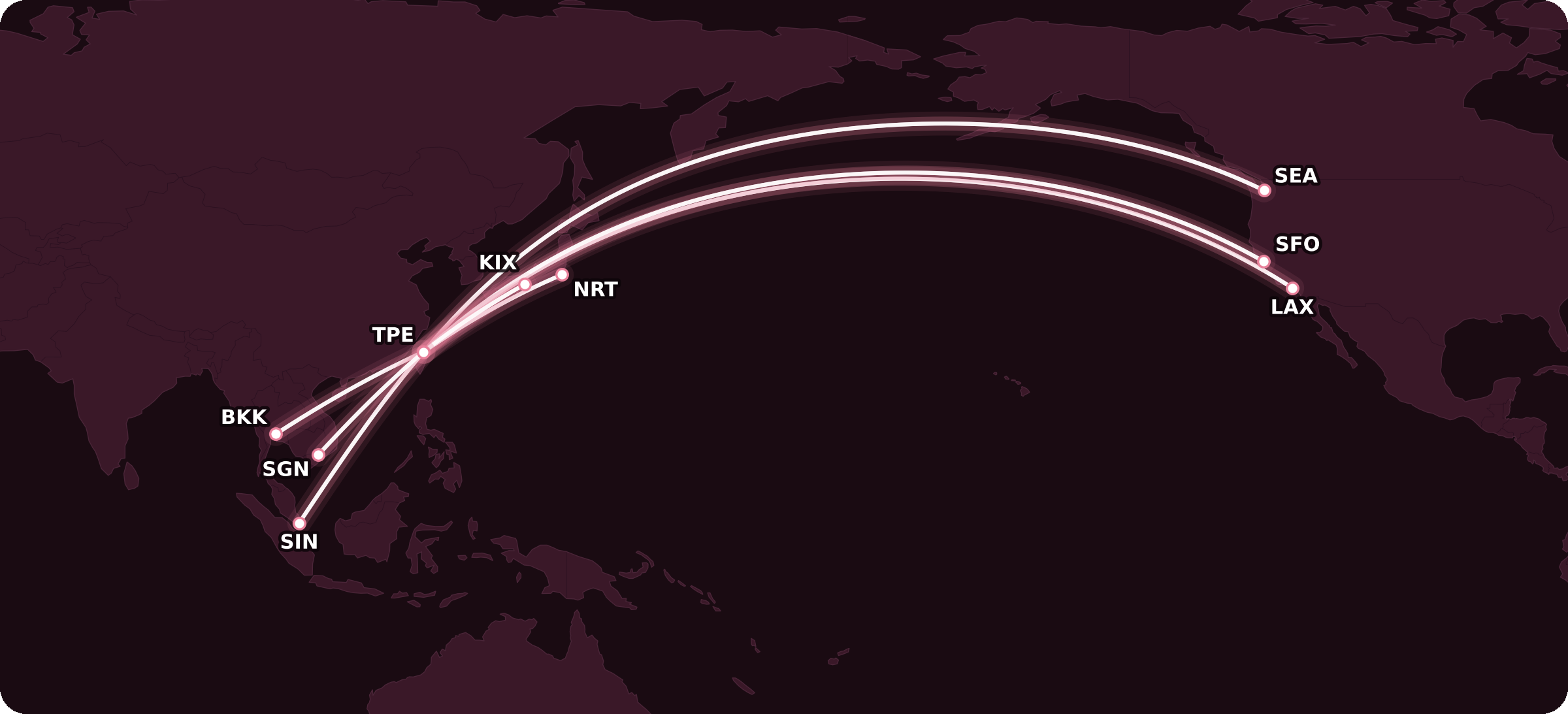 From Taipei, Starlux connects to destinations across Asia – including Tokyo, Osaka, Bangkok, Singapore, Ho Chi Minh City, Penang, and more. The airline's network is growing rapidly.