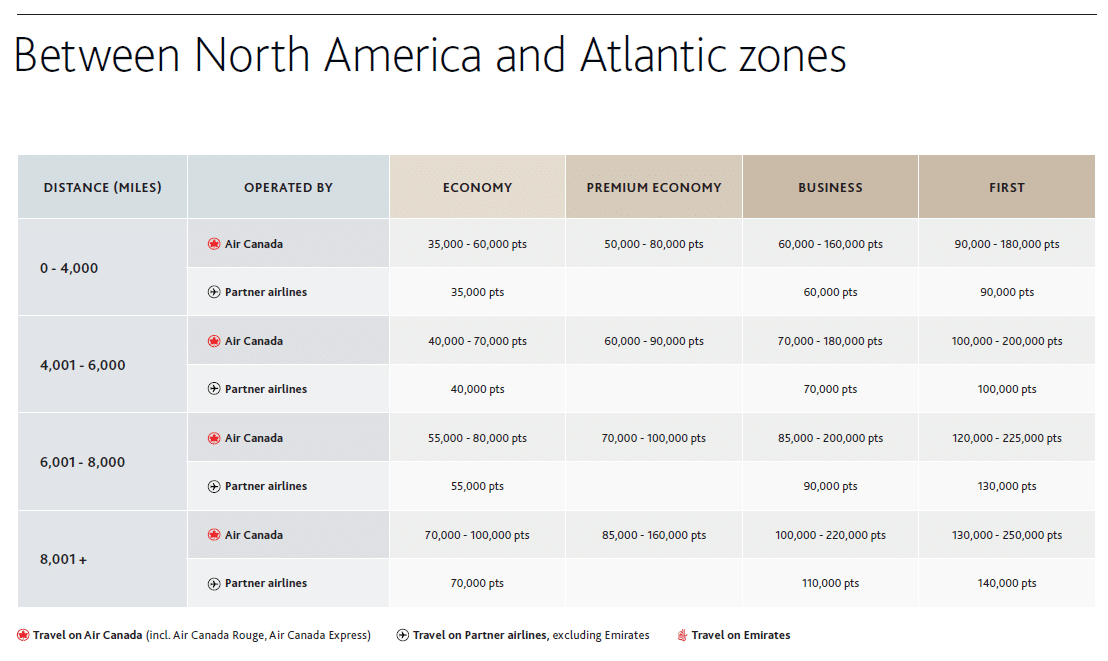 Through Aeroplan, you can redeem Swiss awards based on a distance and zone-based charts for partner flights. On the redemption charts, Canada and the US are in the North America zone, while Europe is in the Atlantic zone.