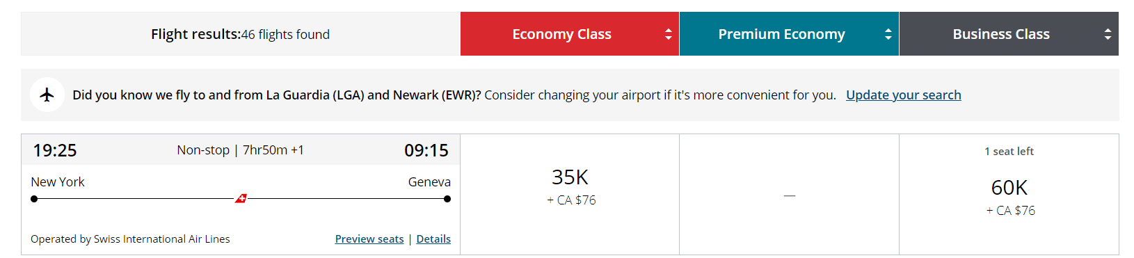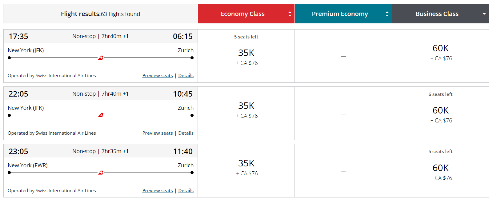 Partners like Air Canada, on the other hand, share the same Swiss “saver award” inventory. Partners don’t usually impose a dynamic pricing model on their partners’ flights, but you’re understandably limited to fewer seats.