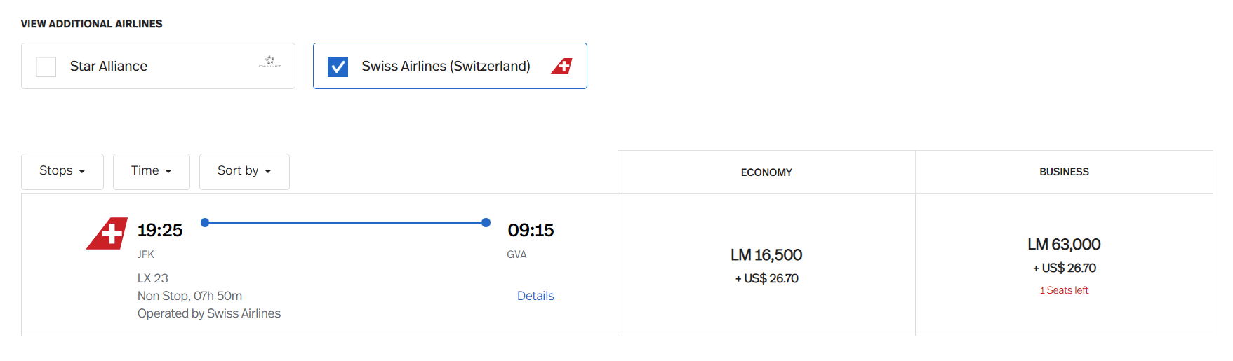 To find out how many miles you’ll need, you must go through United’s flight search engine. For example, the same New York to Geneva flight above yields a cost of 73,000 miles plus $5.60 (USD) in taxes.