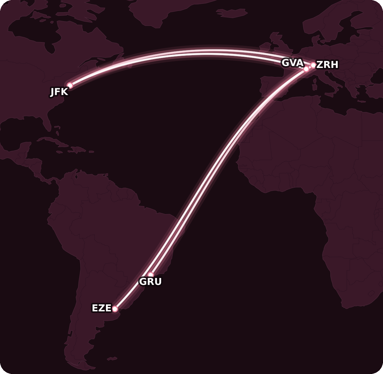 In fact, almost all Swiss First Class flights run out of Zurich, with only one route between Geneva and New York (JFK), as well as a single fifth freedom flight from São Paulo to Buenos Aires.