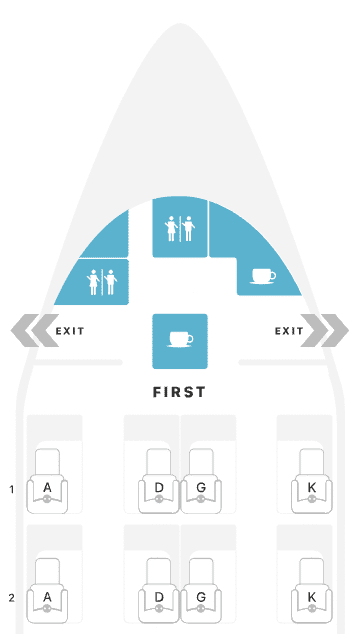 All aircraft contain eight First Class seats in the same 1-2-1 configuration across two rows.
