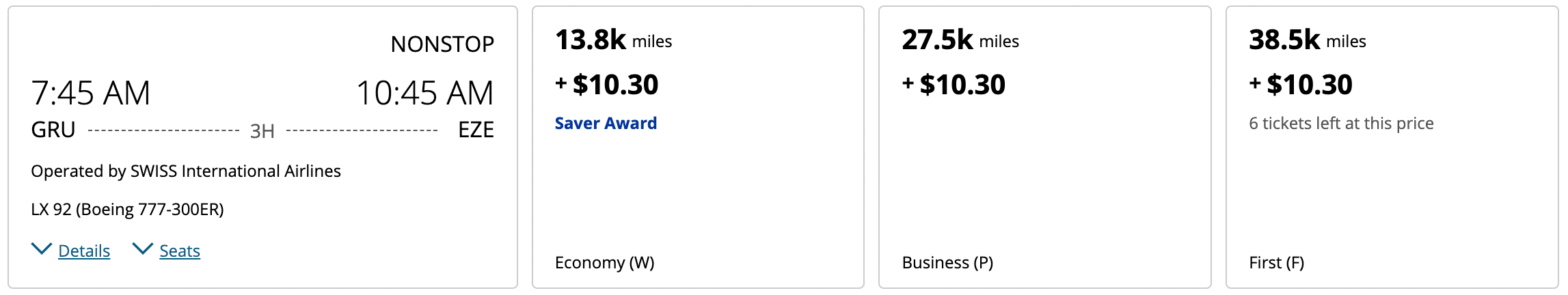 In this case, Swiss frequently releases First Class space to be booked with United miles from São Paulo to Buenos Aires.
