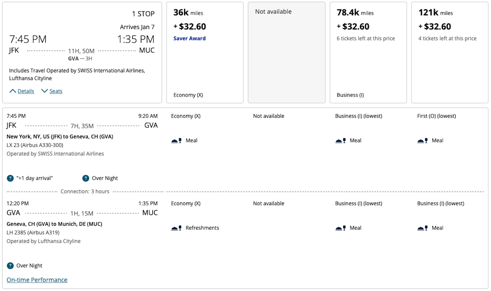 In this example, the New York (JFK) to Geneva segment was bookable in First Class; however, if you searched New York (JFK) to Geneva alone, no space was available.