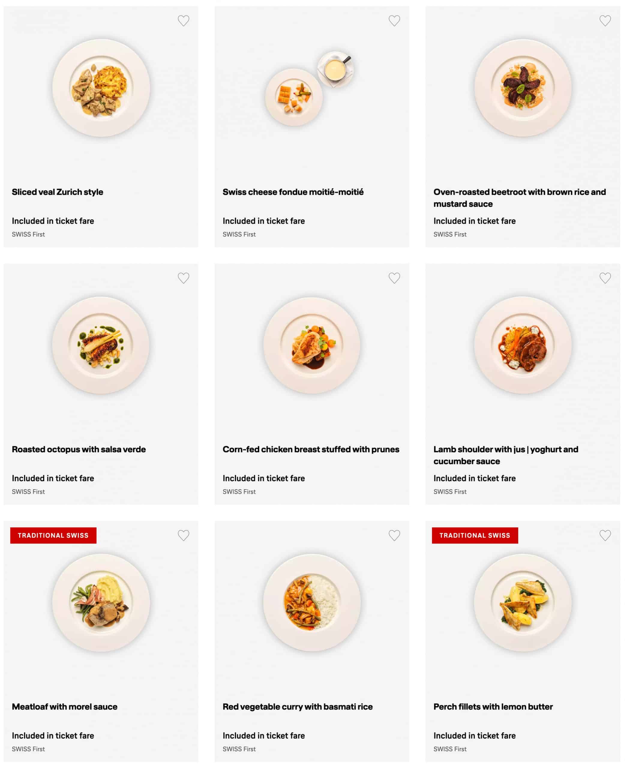 You can get an idea of what the menu will include by heading to the Swiss First Class website. Typically, the meals include various types of elegantly prepared meat or seafood dishes, with a handful of vegetarian items available for selection as well.