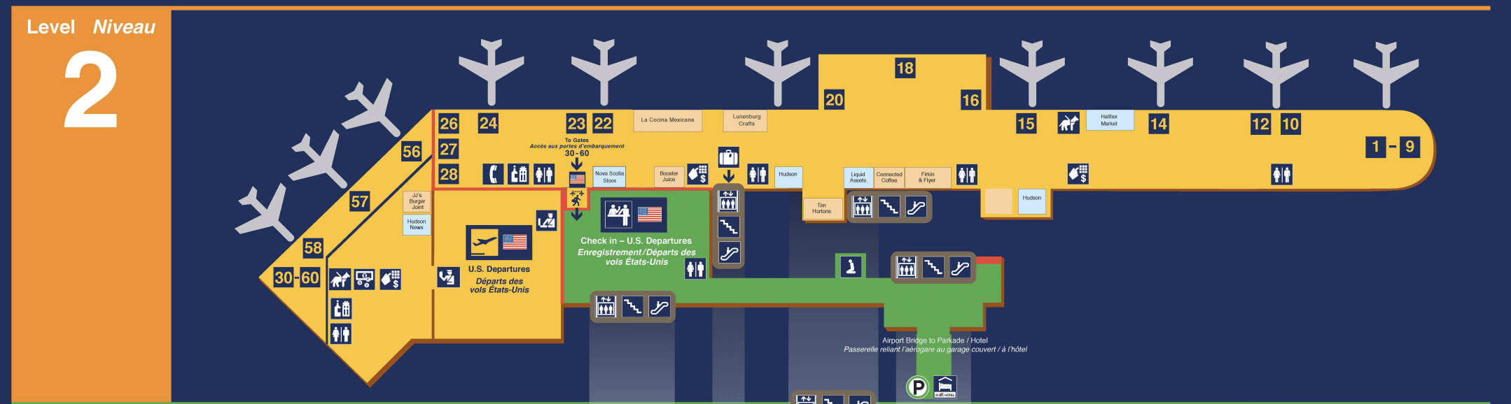 Halifax Stanfield International Airport has one terminal building, which is divided into two levels: the Departures Level and the Arrivals Level.