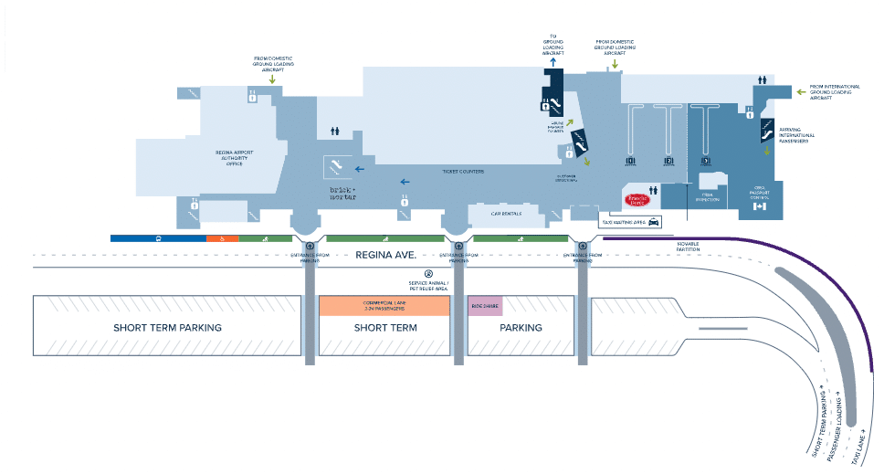 Regina International Airport is served by a few taxi companies, which pick up passengers in the commercial lane, located in short-term parking across from the arrivals doors.