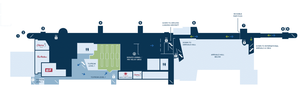 The first floor is home to the check-in counters, car rental counters, international and domestic baggage carousels, and Canada Border Services Agency passport control.