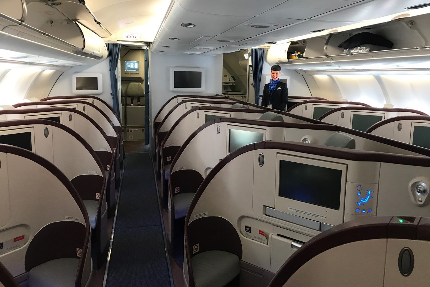 What does Air Serbia A330 business class look like, you might ask? They have standard aisle-facing herringbone seats, similar to the ones aboard Air Canada’s A330 and Air New Zealand’s 777 and 787.