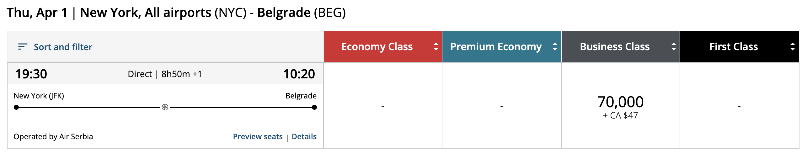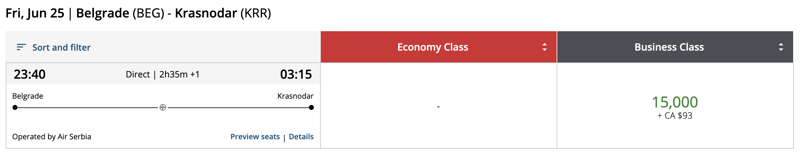 As for Air Serbia’s intra-European routes, most are within 1,000 miles of Belgrade and will cost 7,500 Aeroplan points in economy class or 15,000 Aeroplan points in business class, one-way.