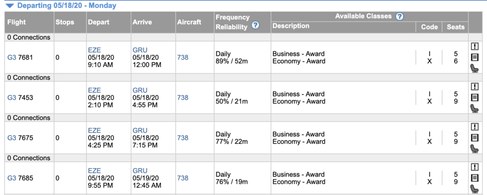 The itinerary also contains a segment on GOL Airlines, the Brazilian low-cost carrier that partners with Aeroplan. You can’t search for GOL award space online, and the ExpertFlyer readings aren’t reliable either – for example, this is what ExpertFlyer showed for GOL space on my desired date, but Aeroplan wasn’t able to access any of the space: