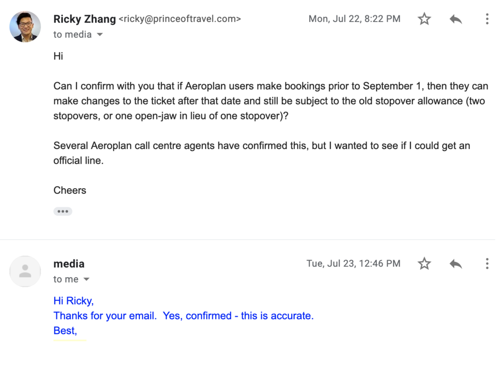 Below is the email exchange with an Air Canada spokesperson confirming this: