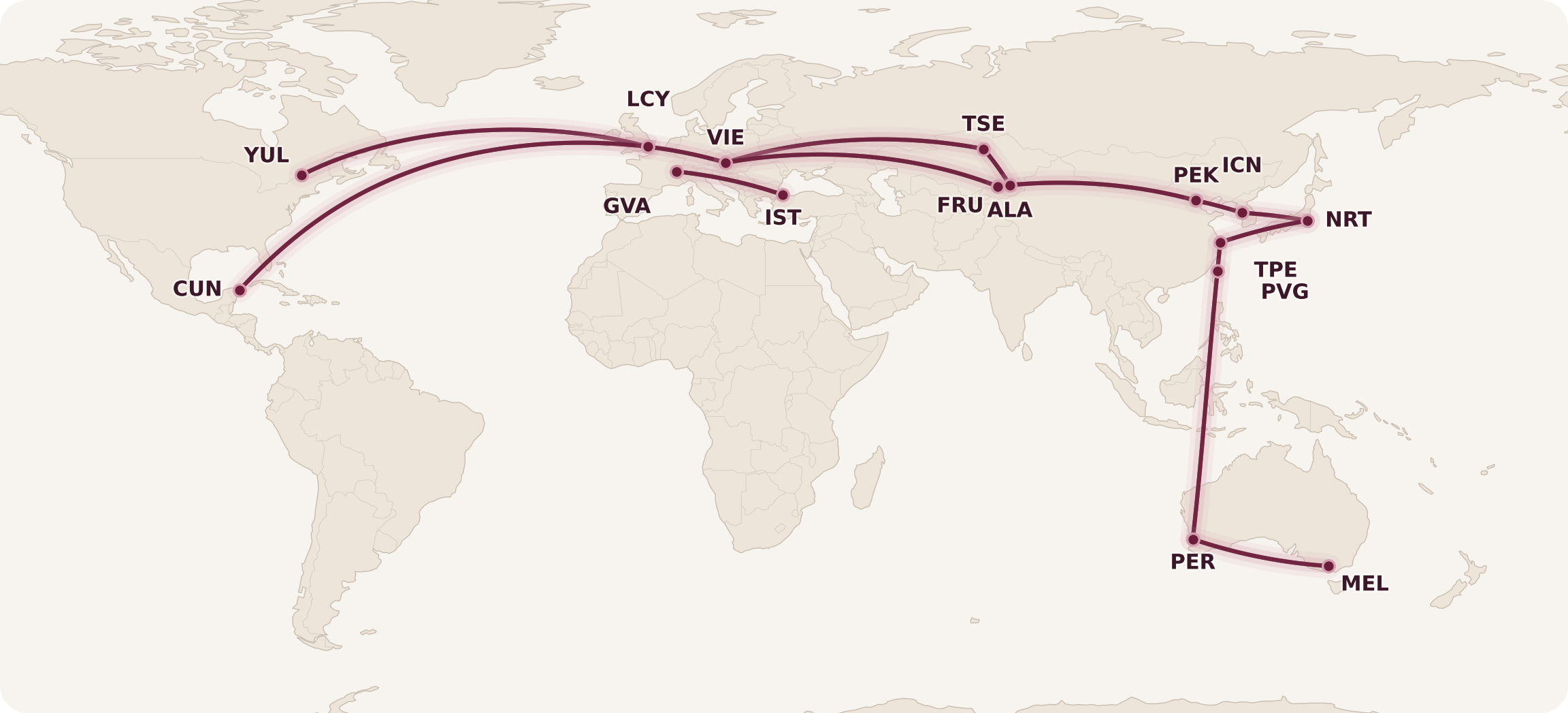 I’ve already written about my November 2019 round-the-world trip, which will bring me to Kazakhstan, Perth, and Geneva, with long layovers in Cancún, Shanghai, and Tokyo.