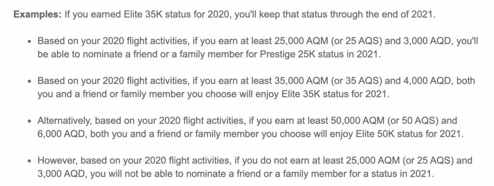 And if you were to only organically qualify for Prestige 25K status based on your 2020 activity, then you’d be able to gift Prestige 25K to a friend or family member – even while you continue to enjoy Elite 35K status throughout the rest of 2021.