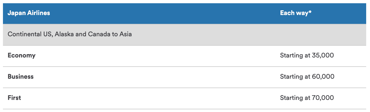 - Japan Airlines First Class between North America and Asia for 70,000 miles, with a stopover in Tokyo; or business class for 60,000 miles