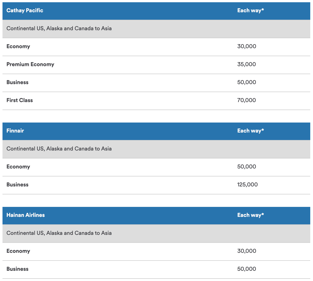 - Cathay Pacific First Class between North America and Asia, Africa, or the Middle East for 70,000 miles, with a stopover in Hong Kong; or business class for 50,000 miles to East Asia