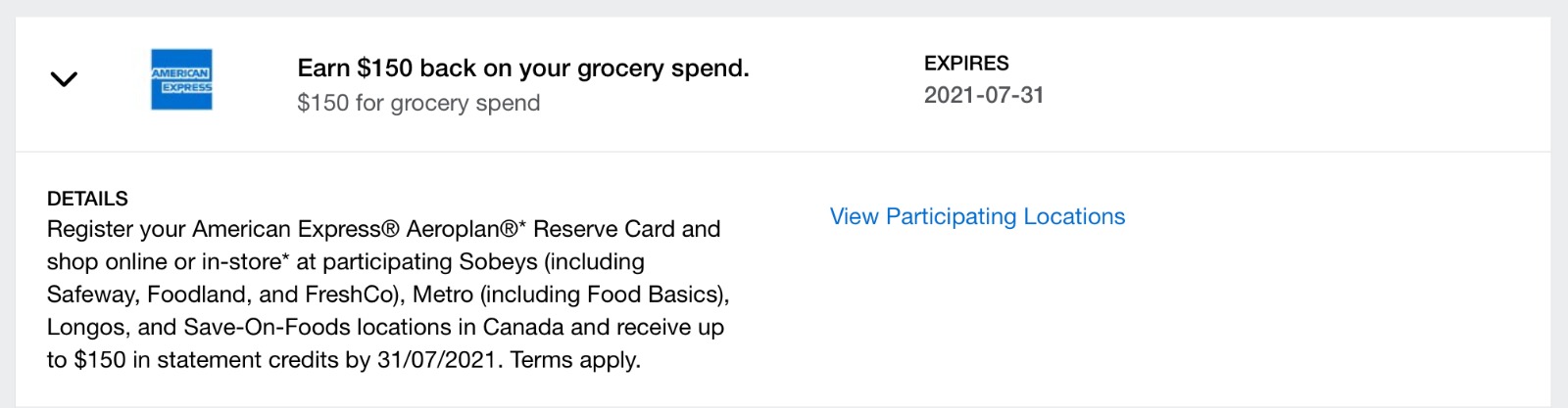 Now, Amex has extended a similar offer to another one of its premium cards, the American Express Aeroplan Reserve Card. Check your Amex Offers for $150 back on $150 spent on groceries from now until July 31, 2021 – as good as a cash credit!