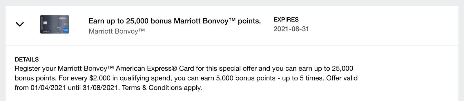 There’s another new Amex Offer making the rounds for targeted cardholders with the American Express Marriott Bonvoy Card. From now until August 31, 2021, you’ll have the opportunity to earn up to 25,000 Bonvoy points by spending on the card.