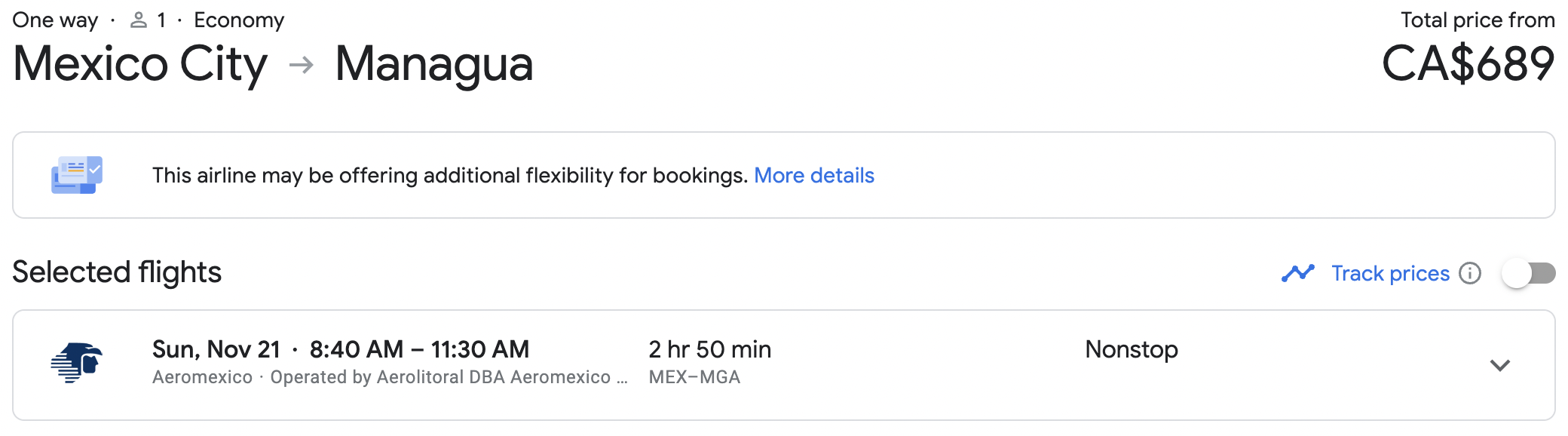 - Managua to Mexico City, Aeromexico business class, departing 12:35pm and arriving 3:30pm