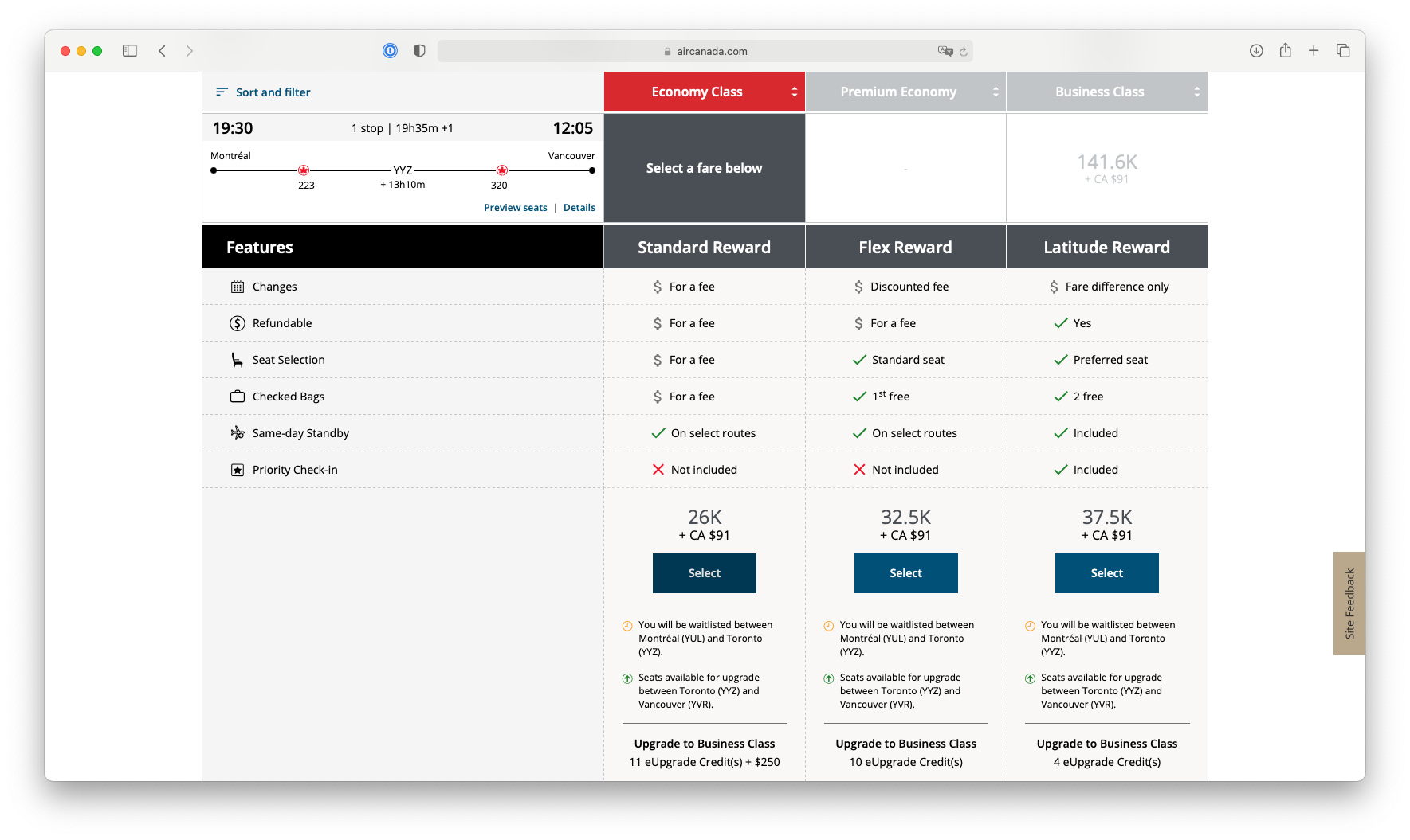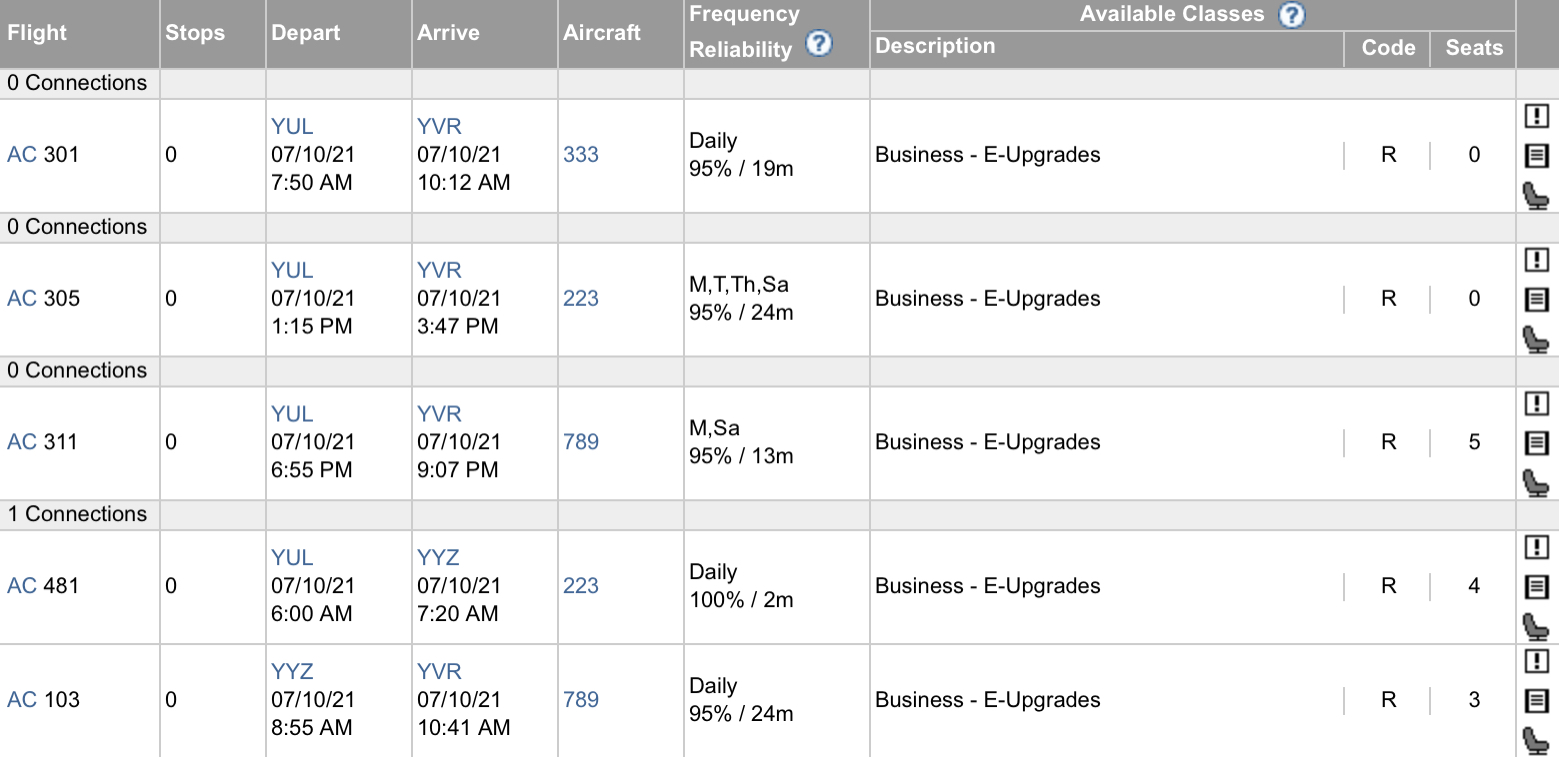 Read moreEver since Aeroplan introduced the dynamic pricing model, Air Canada award seats do not show up on ExpertFlyer. The only fare bucket that displays availability is “R”, which stands for eUpgrades. When there is no space in that booking class, passengers cannot confirm an upgrade instantly; instead, they are waitlisted.