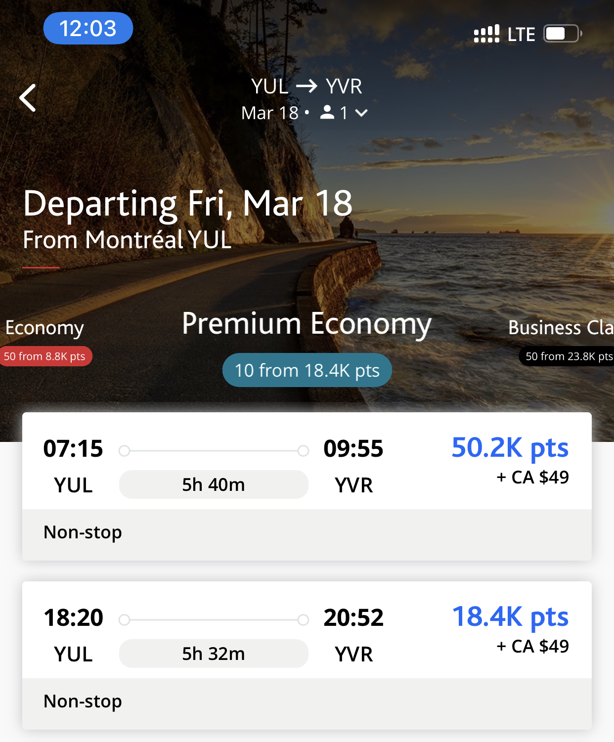 Aeroplan offers premium economy for 18,400 points on AC311, arriving at 20:50 on March 18. Since this is towards the lower end of the dynamic pricing model, I’ll be able to incorporate it into a larger partner itinerary without inflating the price point of the overall booking.