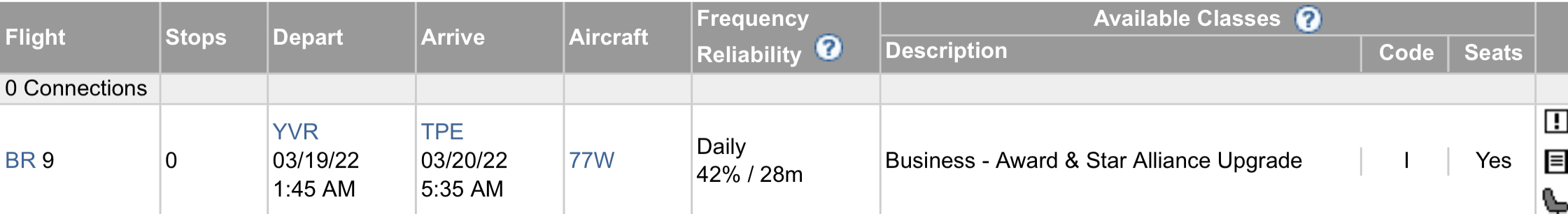 There happens to be business class on EVA Air on March 19, which is an amazing experience that Ricky has tried on both the 787 and the 777. The flight is BR9 from Vancouver (YVR) to Taipei (TPE).
