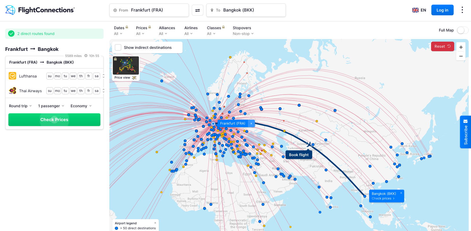The next step is to plan the itinerary around the longest segments, which are usually hardest to find availability. There are two here: Toronto–Tokyo and Bangkok–Frankfurt. Using FlightConnections, I look for direct routes.
